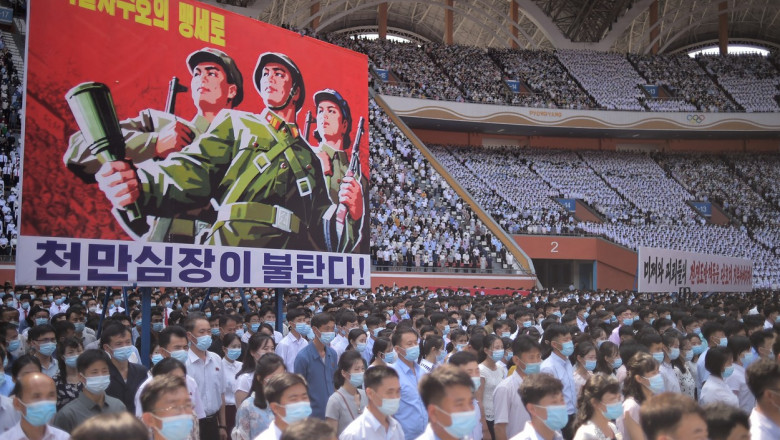 Imagini difuzate de presa de stat nord-coreeană arată un stadion plin de oameni, iar unii au parcarte cu mesaje precum "Teritoriul SUA este în raza noastră" sau "Statele Unite imperialiste distrug pacea".