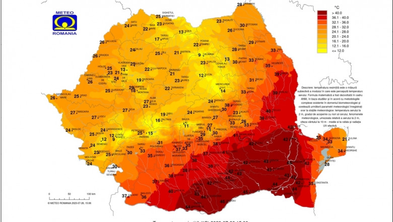 Astfel apar diferențe între temperatura aerului (40 de grade la Giurgiu) și temperatura resimțită (45 de grade tot la Giurgiu).