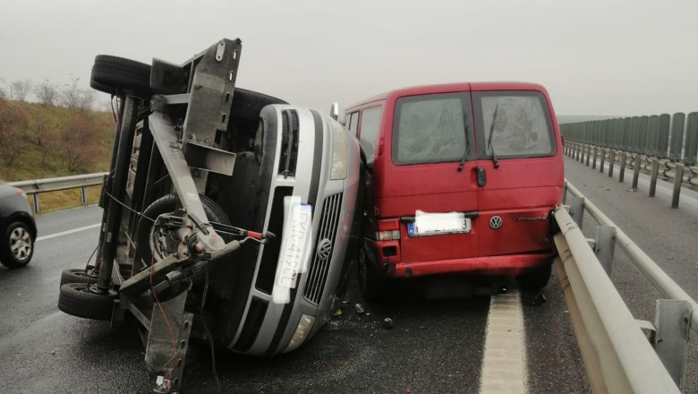 Două autoturisme și o autoutilitară cu platformă au fost implicate, sâmbătă, la prânz într-un accident pe A1, în localitatea Seceani, pe sesnul de mers Timișoara - Arad. În urma impactului, unul dintre vehicule s-a răsturnat, iar o persoană a fost rănită. Drumul este blocat, anunță IPJ Timiș.