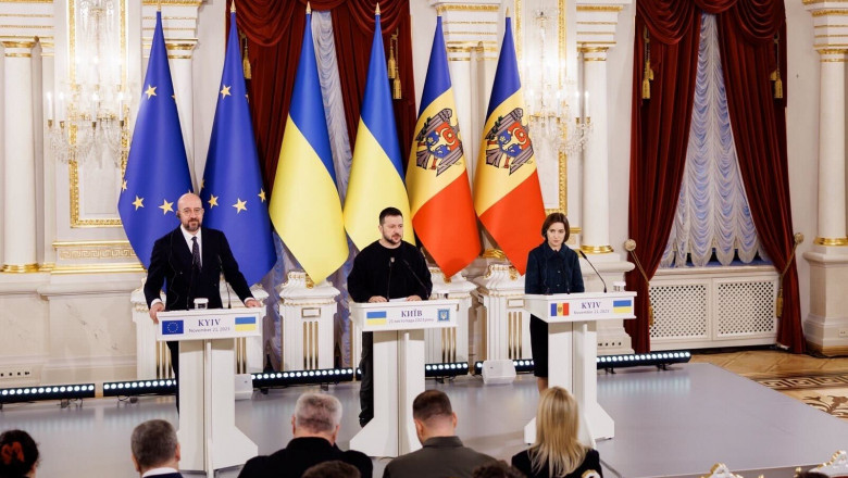 Maia Sandu a discutat marţi la Kiev cu preşedintele Ucrainei, Volodimir Zelenski, şi cu preşedintele Consiliului European, Charles Michel, despre următorii paşi în procesul de aderare la UE. Vizita preşedintei Republicii Moldova şi a preşedintelui Consiliului European a intervenit în ziua în care Ucraina a marcat 10 ani de la începutul protestelor Euromaidan, care l-au îndepărtat de la putere în 2014 pe preşedintele prorus Viktor Ianukovici şi au înscris ţara pe o direcţie proeuropeană.
