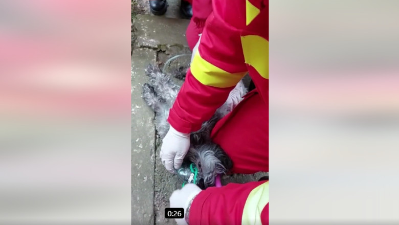 Dintr-o înregistrare video, publicată pe rețelele sociale de IGSU, se vede cum trei pompieri stau în jurul câinelui în timp ce îi administrează oxigen.