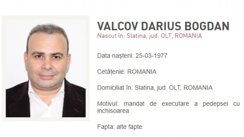 Darius Vâlcov a fost dat în urmărire generală de Poliţia Română, după ce nu a fost găsit pentru a fi încarcerat, el având de executat o condamnare de 6 ani de închisoare într-un dosar de trafic de influenţă şi spălare de bani.