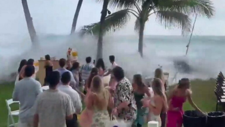 O nuntă care avea loc pe malul oceanului în Hawaii a fost întreruptă de valuri uriașe. În toiul petrecerii, apa a năvălit pe peluza unde se aflau invitații.