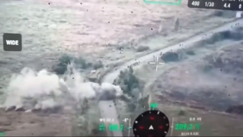 În primul clip publicat de ministerul apărării de la Kiev se vede o coloană alcătuită din câțiva zeci de militari ruși care se deplasează de-a lungul unei șosele și care sunt surprinși în câmp deschis de artileria ucraineană.