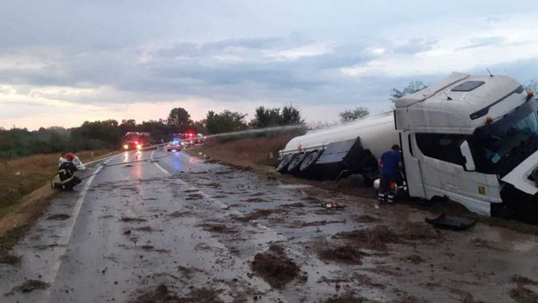 „În accident sunt implicate o autocisternă şi un autoturism, în cele două autovehicule aflându-se trei persoane. Autocisterna este încărcată cu 23 tone motorină şi 10 tone benzină. În urma accidentului, şoferul autoturismului a rămas încarcerat, iar autocisterna s-a răsturnat în afara carosabilului. La sosirea echipajelor de intervenţie au fost găsite cele două autovehicule avariate, iar o persoană era încarcerată. Cealaltă persoană aflată în autoturism s-a autoevacuat până la sosirea salvatorilor. Autocisterna este avariată, dar nu există scurgeri de combustibil”, a arătat sursa citată de News.ro.