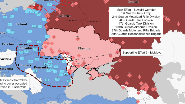 Hărțile de mai jos prezintă desfășurarea actuală a NATO, desfășurarea ucraineană teoretică bazată pe pozițiile militare ucrainene de dinainte de război și concentrările noționale de forțe rusești pentru o invazie a țărilor baltice. Scenariul de bază presupune că rușii vor acorda prioritate tăierii Coridorului Suwalki care se întinde între nord-vestul Belarusului și exclava rusă Kaliningrad pentru a împiedica NATO să întărească sau să aprovizioneze statele baltice, în timp ce unitățile blindate și aeriene ruse pun stăpânire pe statele baltice.