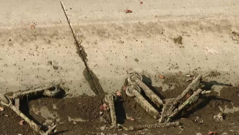 Trotinete pe fundul Dâmboviței, în Capitală. Este imaginea pe care au văzut-o bucureștenii astăzi după ce râul care traversează Capitala a fost secat pentru curățare. După ce apa s-a retras, trotinetele au ieșit la suprafață.