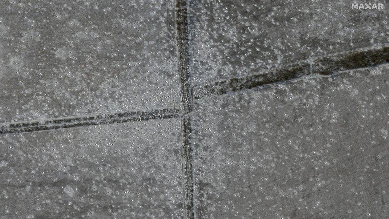 Imagine din satelit făcută pe 4 ianuarie 2023 de Maxar Technologies, care arată clădiri de apartamente și cratere distruse în Bakhmut. Foto: Profimedia Images Deschide galeria foto