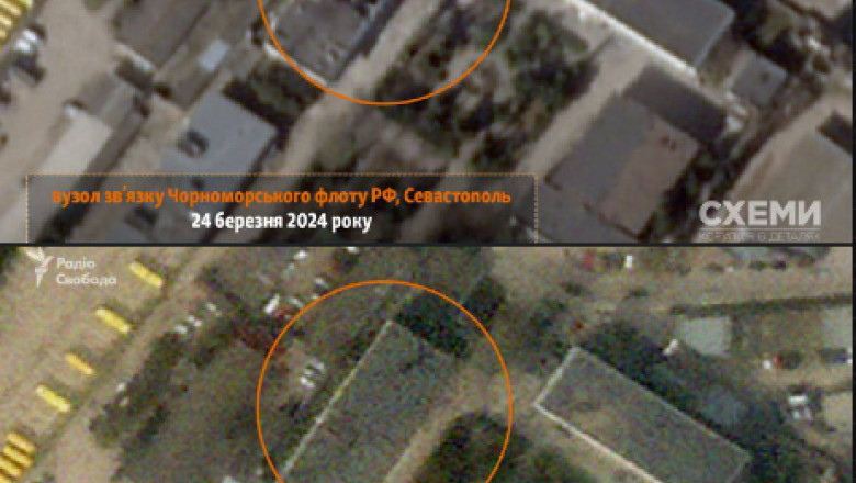 Imagini din satelit arată clădirea distrusă a centrului rus de comunicaţii de la Marea Neagră, portul Sevastopol, după ce armata ucraineană a comunicat că a lovit baza și două nave.