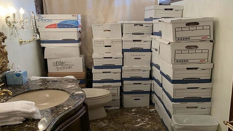 Cutii cu documente găsite într-o debara cu haine la reședința lui Donald Trump. Foto: Profimedia Deschide galeria foto