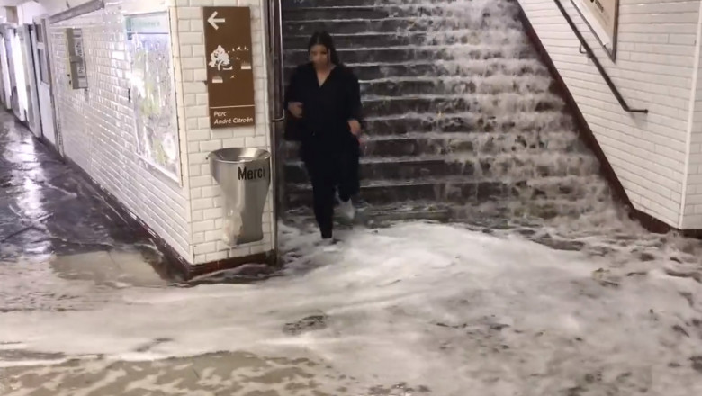 După ce seceta și canicula au ars iarba din parcuri și spațiile verzi, capitala Franței a avut parte de o ploaie intensă care a inundat străzile și metroul.