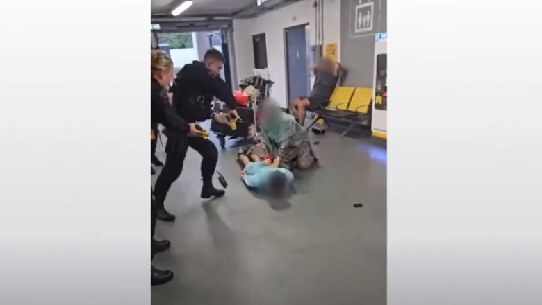 Polițistul în uniformă este filmat ținând un Taser deasupra bărbatului, care stă întins cu fața în jos, după care îl lovește în cap de două ori, în timp ce alți polițiști le strigă oamenilor din jur să nu se apropie.