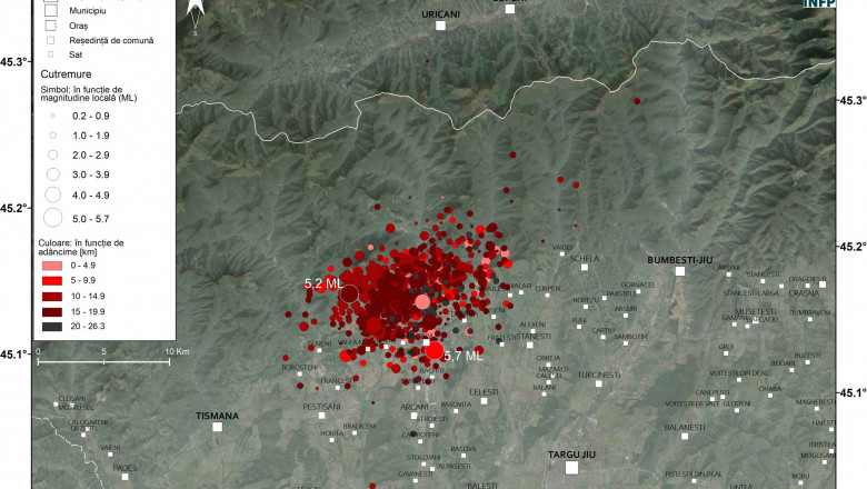 Cutremurele din Gorj s-au produs la adâncimi mici, arată o hartă realizată de INFP. Primul seism puternic, cel de 5,2 din 13 februarie, s-a produs la o adâncime de 15 kilometri.