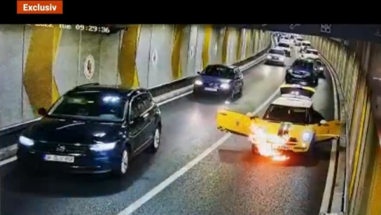 Momentul în care o mașină a luat foc în mers în pasajul Unirii din București a fost surprins de una din camerele de supraveghere din zonă.