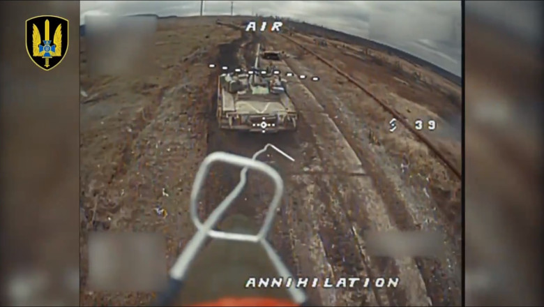 În imaginile publicate pe rețelele sociale, tancul rușilor este ajuns din urmă de o dronă. În momentul în care acesta este lovit, are loc o explozie puternică. Turela tancului este aruncată câțiva metri în aer, iar tancul ia foc.