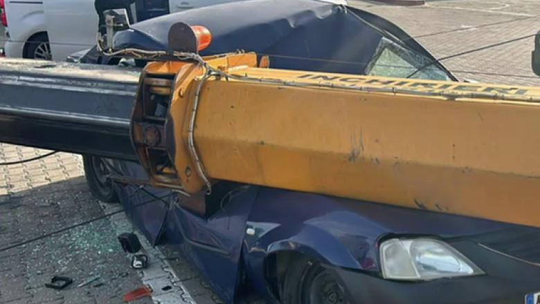 O macara s-a prăbușit peste o mașină parcată lângă o benzinărie, în Capitală. Din primele informații, nu era nicio persoană în autoturism.