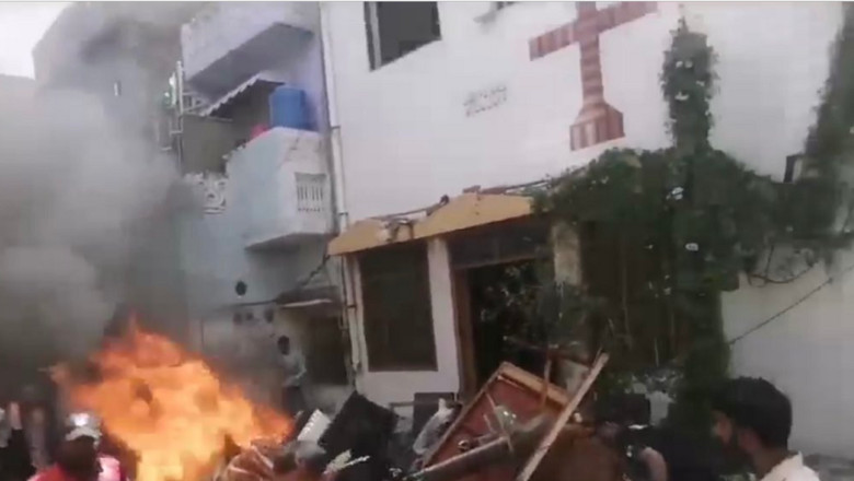 Imagini difuzate pe reţele de socializare surprind fum ieşind dintr-o biserică şi din mobilier - paturi şi scaune - incendiat în stradă.