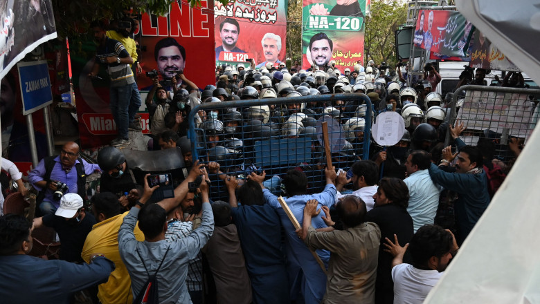 Câteva sute de susținători ai lui Khan s-au adunat în fața casei lui la puțin timp după ce o echipă de polițiști a ajuns de la Islamabad pentru a pune în aplicare un mandat de arestare pe numele fostului prim-ministru, a spus purtătorul de cuvânt al guvernului pakistanez, Amir Mir.