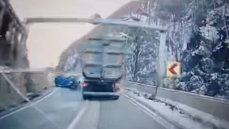 În imgini se vede cum camionul merge cu viteză mare și într-o curbă la stânga trece peste linia continuă. Din sens opus venea o Skoda, care a lovit cabina camionului ;i a ricoșat în zidul de beton de pe marginea șoselei.