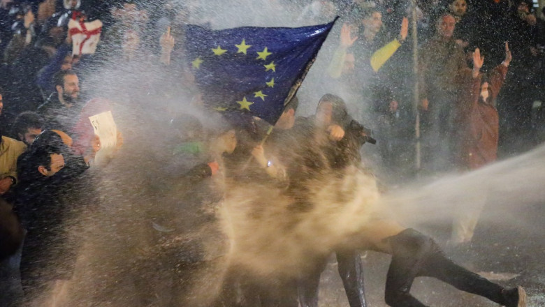 Poliția din Georgia a folosit gaze lacrimogene și tunuri cu apă împotriva protestatarilor din Tbilisi, după ce parlamentul a anunțat că sprijină un proiect de lege privind „agenți străini”. Foto: Profimedia Images Deschide galeria foto
