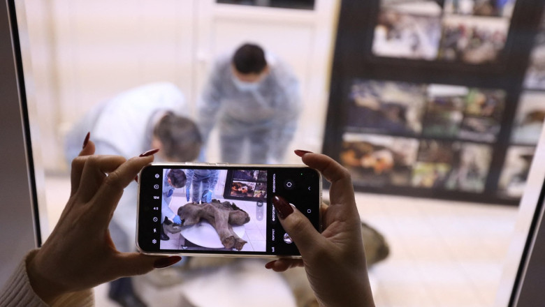 Rămășițele vechi de 50.000 de ani ale unui pui de mamut au fost expuse în Rusia, în timp ce oamenii de știință efectuează cercetări asupra animalului.