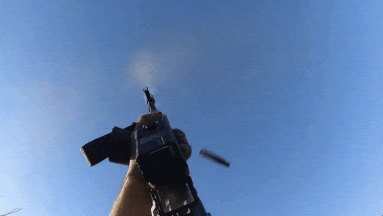 Soldatul termină un încărcător și îl schimbă, continuând să tragă împotriva dronei, dar se prăbușește imediat la pământ și strigă că a fost rănit.