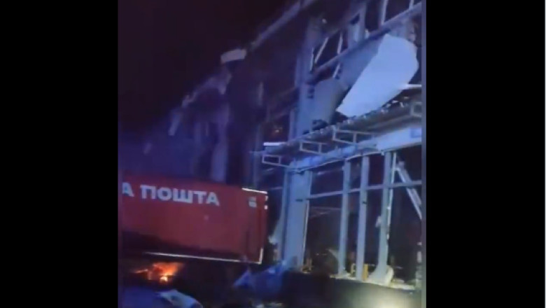 Preşedintele ucrainean Volodimir Zelenski a distribuit o înregistrare video pe reţelele de socializare cu ceea ce pare a fi un depozit grav avariat, alături de resturi şi un container care poartă sigla operatorului poştal ucrainean Nova Poshta.