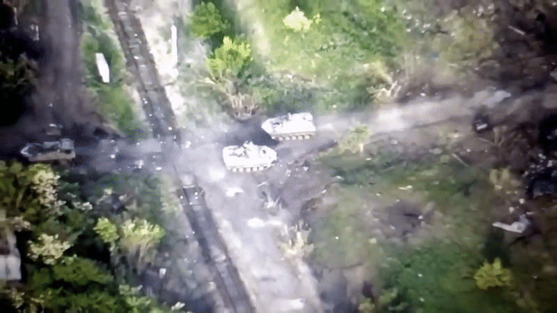 Imaginile, filmate cel mai probabil de-o dronă de supraveghere prezintă trei mașini de luptă BMD-2, blindate folosite de trupele de parașutiști ai armatei ruse, care trec printr-o intersecție de drumuri rurale.