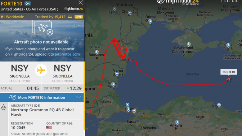 Drona RQ-4 Global Hawk a avut indicativul de zbor „FORTE 10”. Flight Radar 24 a menționat că, spre deosebire de dronele Reaper, această dronă a avut transponderul (folosit pentru monitorizarea și localizarea aeronavei în timp real) deschis pe tot parcursul zborului de deasupra Mării Negre.