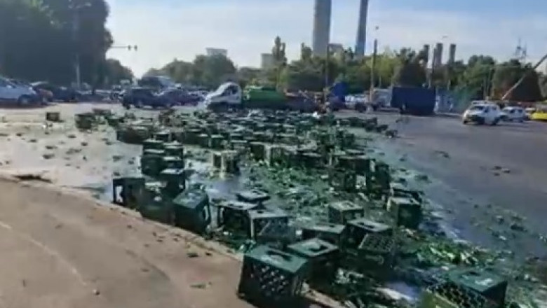 Un camion încărcat cu bere s-a răsturnat la intrarea în Constanța. Sute de sticle au ajuns pe șosea, după ce, într-o curbă, camionul a intrat în balans, iar toată marfa depozitată în interior s-a răsturnat.