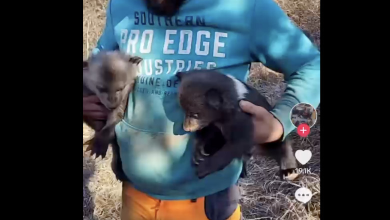 Animalele se zbat, încercând să scape. „Uite aicea, oameni buni, pui de urs!”, spune bărbatul, în timp ce persoana care îl filmează îi spune: „Ce gheare are! Să nu te muşte, mă!”
