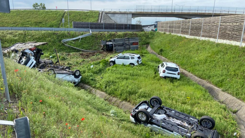 Autoturismele care s-au răsturnat din autotren au fost avariate și se aflau la locul accidentului și luni dimineață.