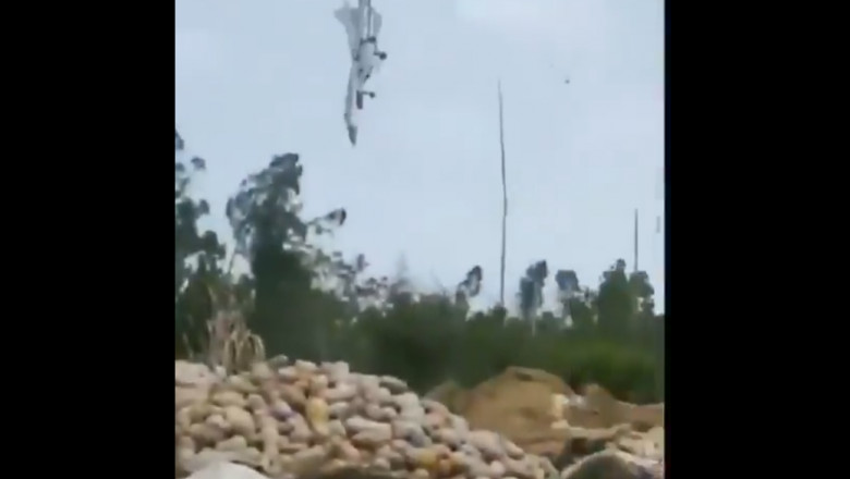 Imaginile distribuite pe reţelele de socializare arată cum avionul militar se prăbuşeşte şi ia foc.