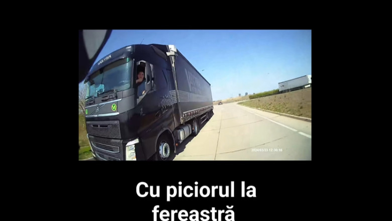 Un șofer de TIR a fost surprins de un polițist pe motocicletă în timp ce circula pe Autostrada A1, pe segmentul Timișoara-Nădlac, cu un picior scos pe geamul lateral.