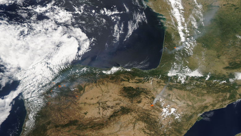 Pe 19 și 20 iulie 2022, sateliții Aqua și Terra de la NASA au capturat aceste imagini cu fumul provenit de la incendiile din Portugalia, Spania și Franța. Punctele portocalii reprezentau incendiile active.