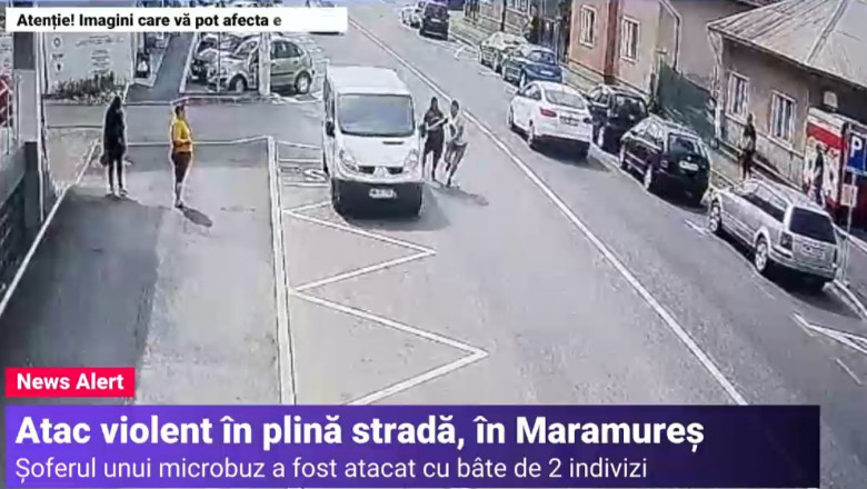 Atac cu bâte în județul Maramureș. Șoferul unui microbuz a fost atacat în plină stradă de doi bărbați. Incidentul violent a fost surprins de camerele de supraveghere din Șomcuta Mare.
