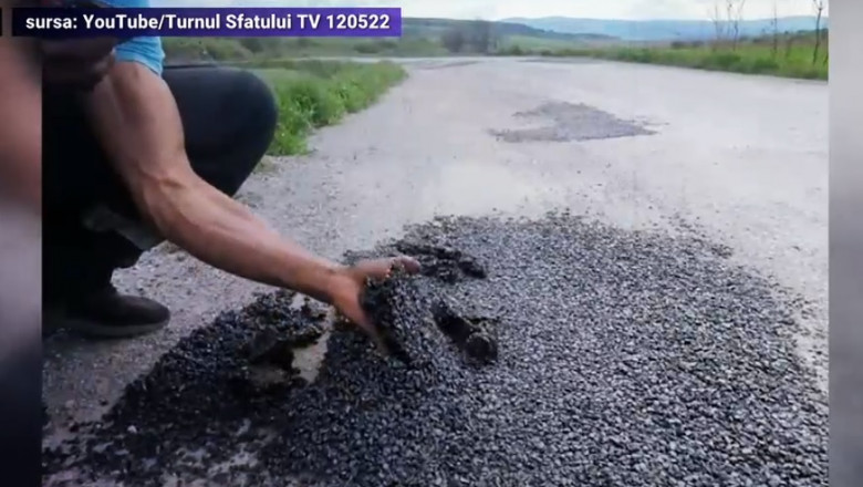 O șosea dată, dimineața, ca reparată s-a stricat până la căderea serii. S-a întâmplat pe un drum județean din Sibiu, unde asfaltul abia peticit s-a deteriorat atât de tare, încât poate fi ridicat foarte ușor cu mâna. Lucrările de reparație aveau o garanție de 6 luni, iar fiecare metru pătrat de asfalt a costat 68 de lei.