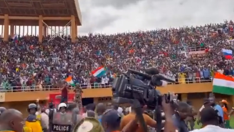Manifestanţii au sfidat temperaturile ridicate şi s-au adunat după-amiază pe stadionul Seini Kountche, cel mai mare din Niger, cu o capacitate de 30.000 de locuri, agitând drapele ale Nigerului, Rusiei şi Burkina Faso.