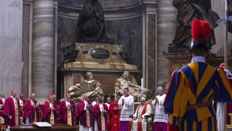 Ceremonia religioasă, care a durat aproximativ o oră şi jumătate, a fost condusă de cardinalul italian Giovanni Battista Re, decanul Colegiului cardinalilor, Papa Francisc sosind într-un scaun cu rotile pentru ultimele minute şi pentru rugăciune.